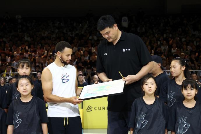 10名来自四川山区学校的小球员向姚明和库里赠送了一份特殊的礼物——一幅由热爱篮球的四川小姑娘们共同创作的画作。姚明和库里也宣布,将联手实施公益计划,支持中国乡村地区青少年女子篮球发展。