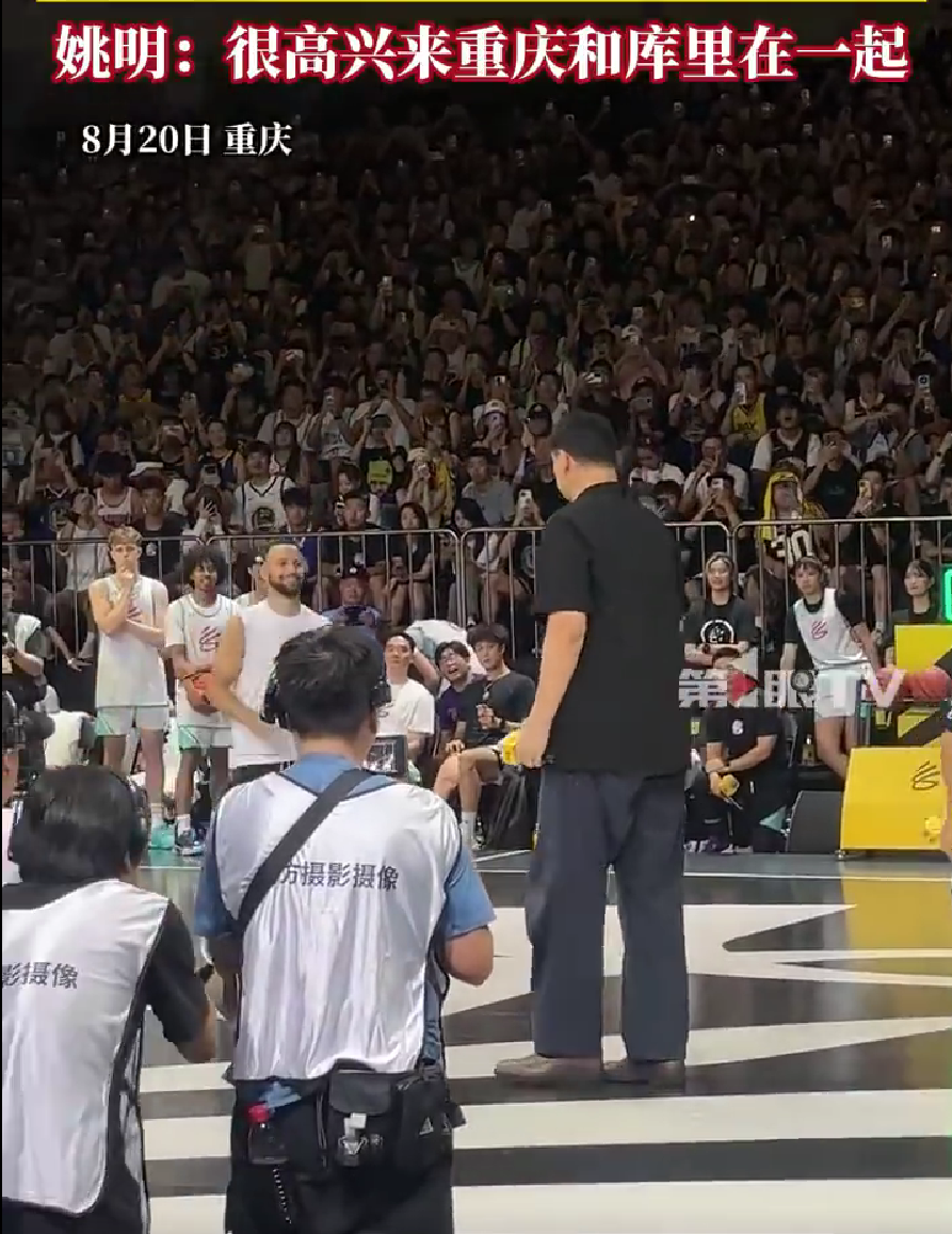 8月20日,重庆国博中心,“库中锋”和姚中锋世纪同框,神秘嘉宾姚明惊喜空降,现场球迷热情欢呼!